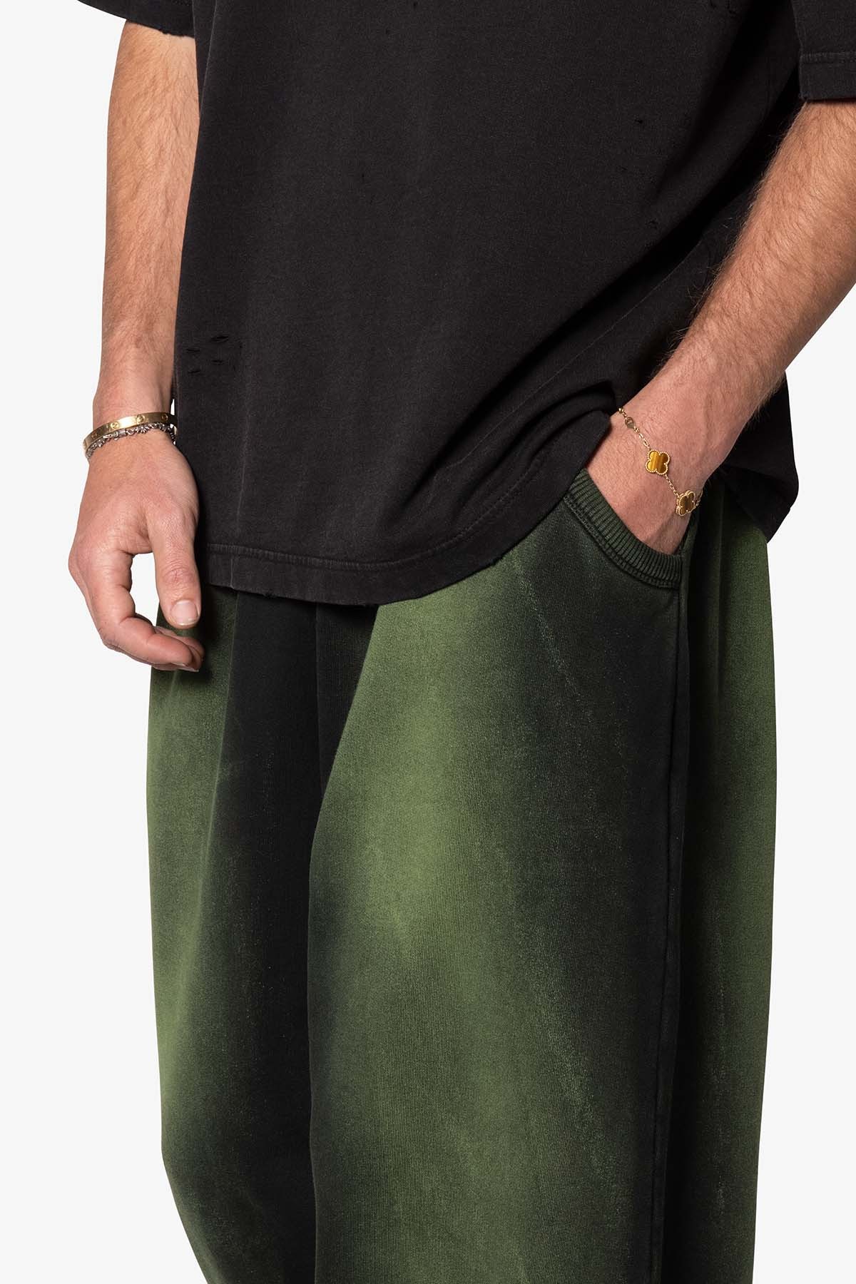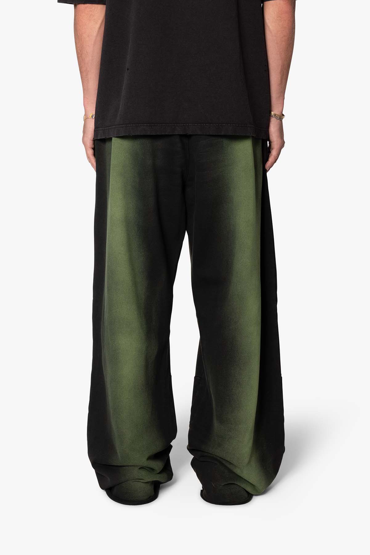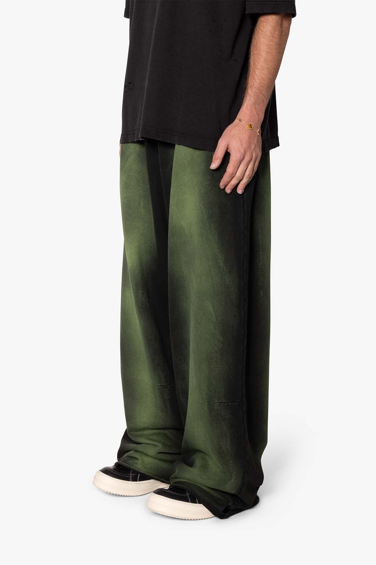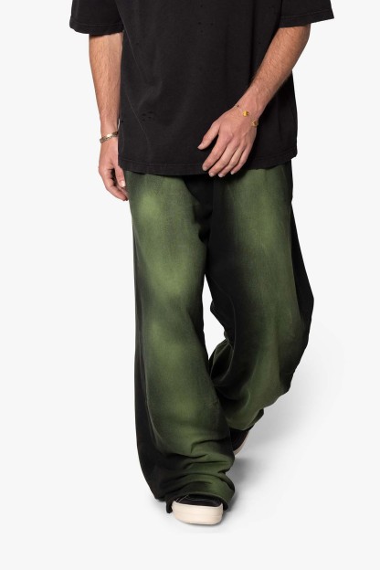 the Sprayed Ultra Baggy Sweatpants are designed with an ultra baggy fit throughout, featuring an elasticized self waist, cotton drawstrings, standard hem at the leg opening, and finished in both a tinted spray wash and brushed fleece fabric.
