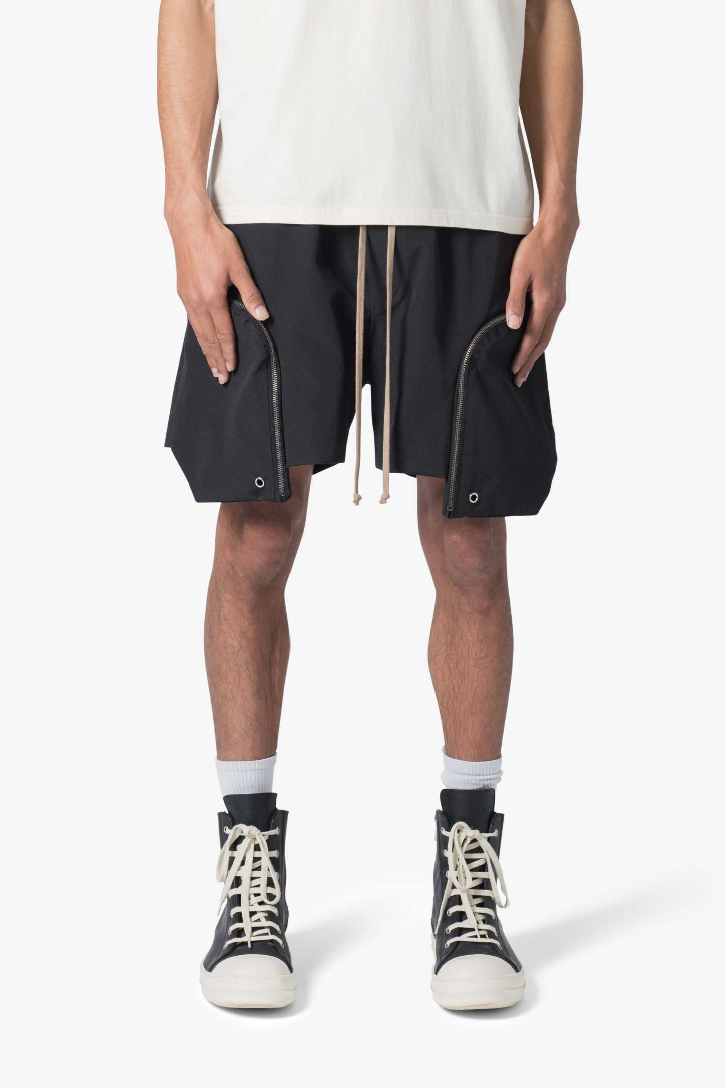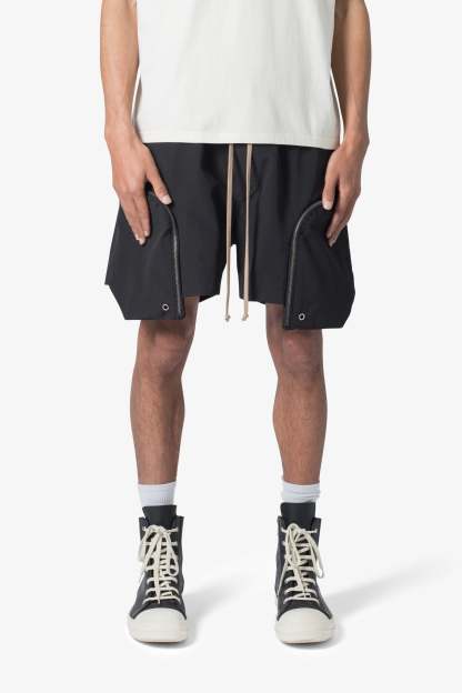 the Front Pocket Geo Shorts are constructed from a polyester fabric in a baggy fit. The shorts feature an elasticized waist, welt pockets, exaggerated zipper pockets that extend past the leg opening with grommet details, and finished with a contrasting cotton drawcords.