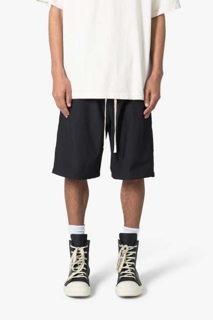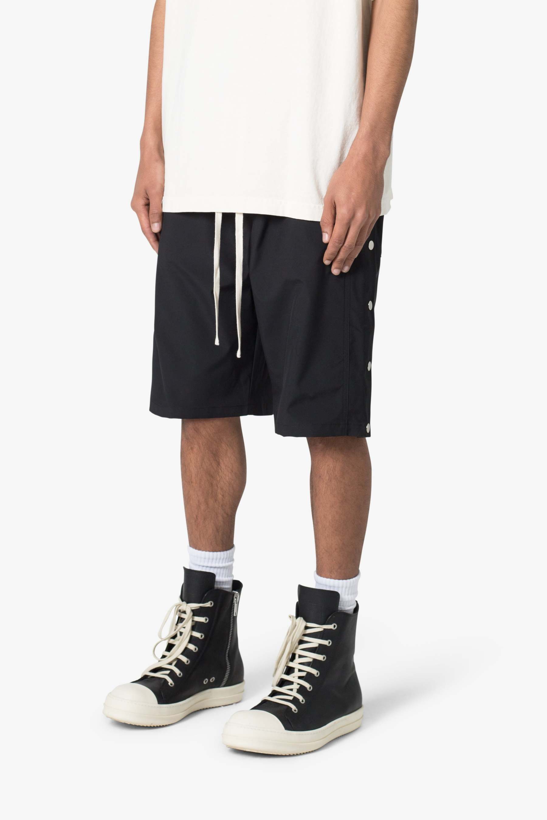 the Side Snap Nylon Shorts are designed in an oversized fit, constructed from a custom developed nylon fabric with lining, contrast drawcord, welt pockets at the side seam, and finished with snap details up the outseam.