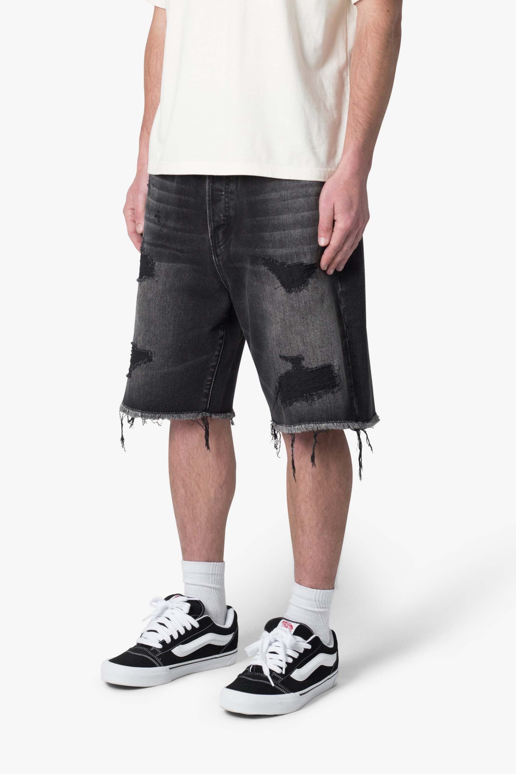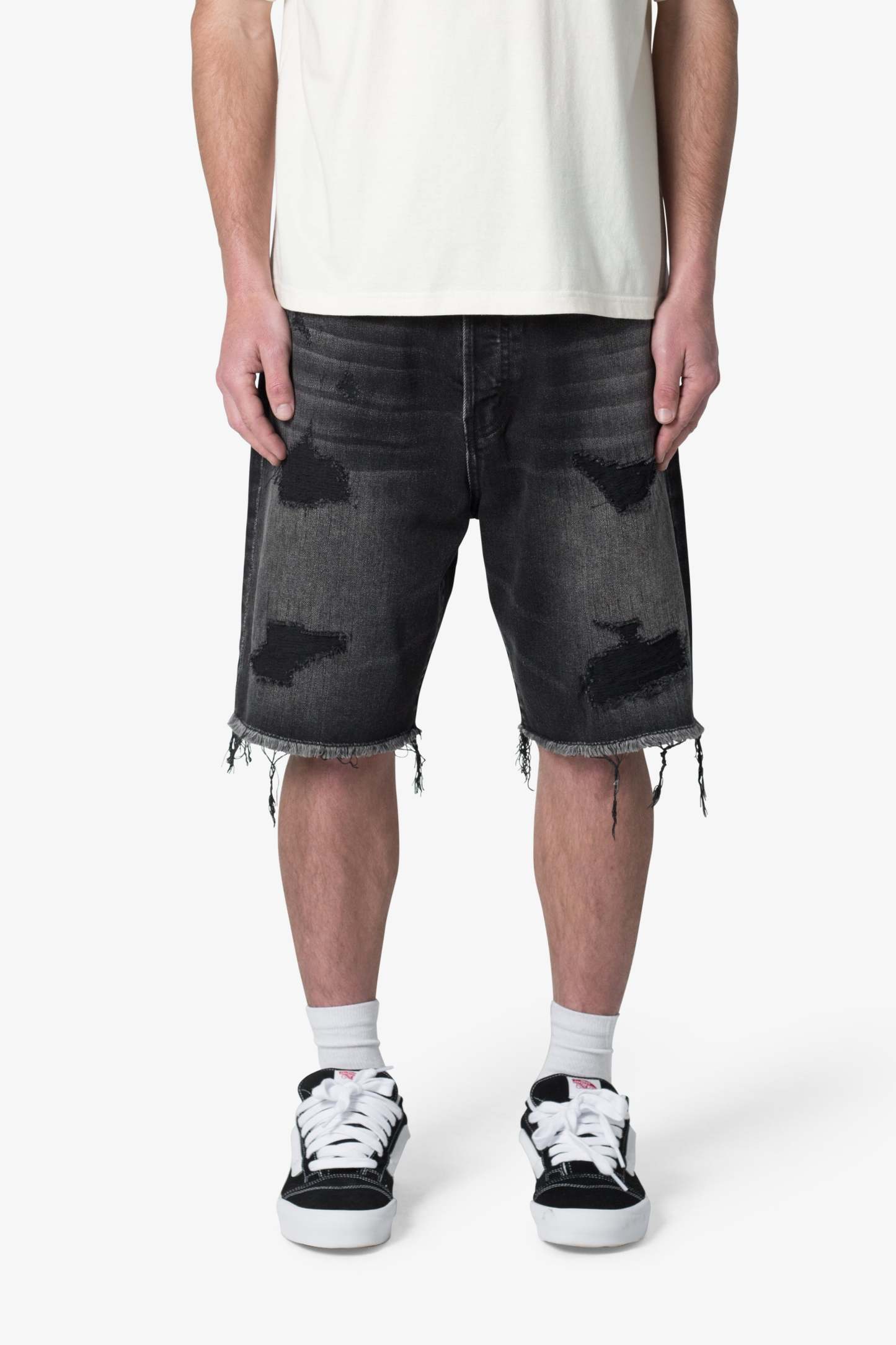 the Baggy Rip Denim Shorts are designed with a relaxed fit throughout, featuring traditional five pocket denim details, raw hem at the leg opening, and finished with a vintage wash and distressing details throughout.