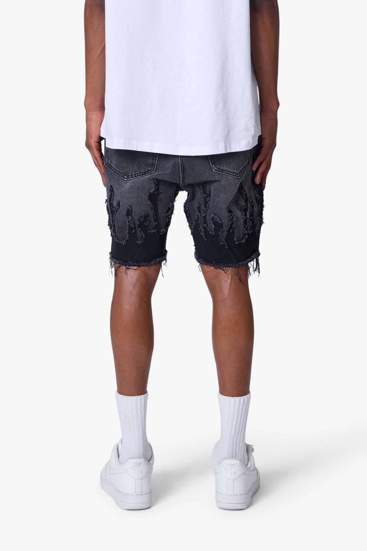 Introducing our Flame Denim Shorts, crafted from 100% cotton denim for ultimate comfort. These shorts feature a standard fit, ensuring a timeless silhouette. With intricate flame and dual-tone detailing, along with a distressed finish, they exude a bold and edgy style.