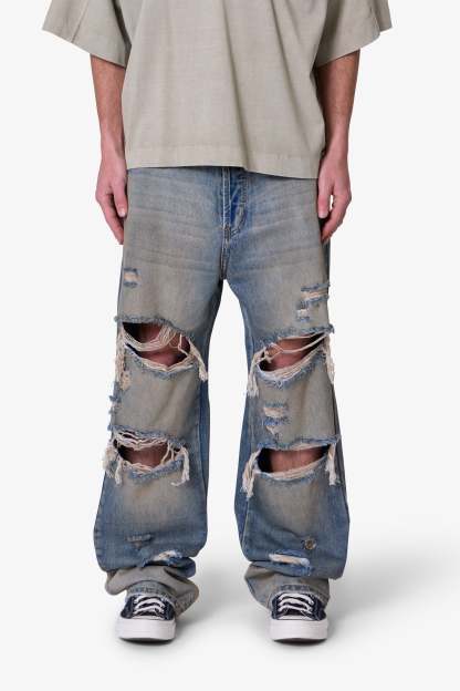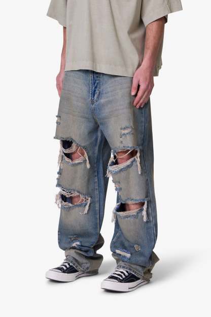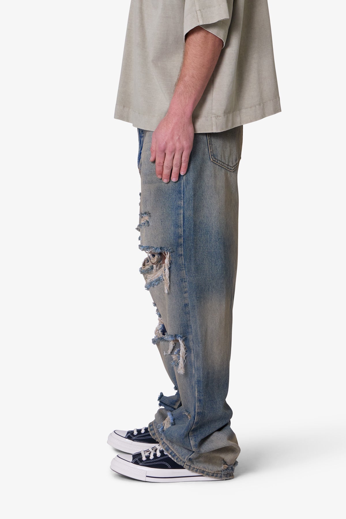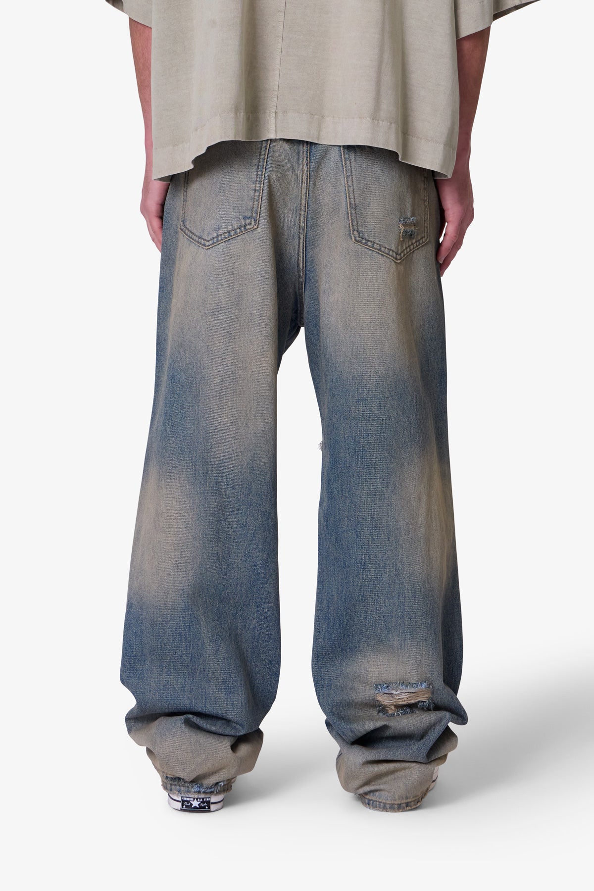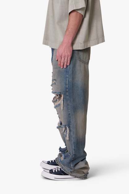 the Ultra Baggy Orange Dusted Denim are designed with a new oversized ultra baggy fit, constructed from denim with a vintage light wash with an oil wash, featuring standard five pocket denim details, distressing at the knees and finished with a button placket.
