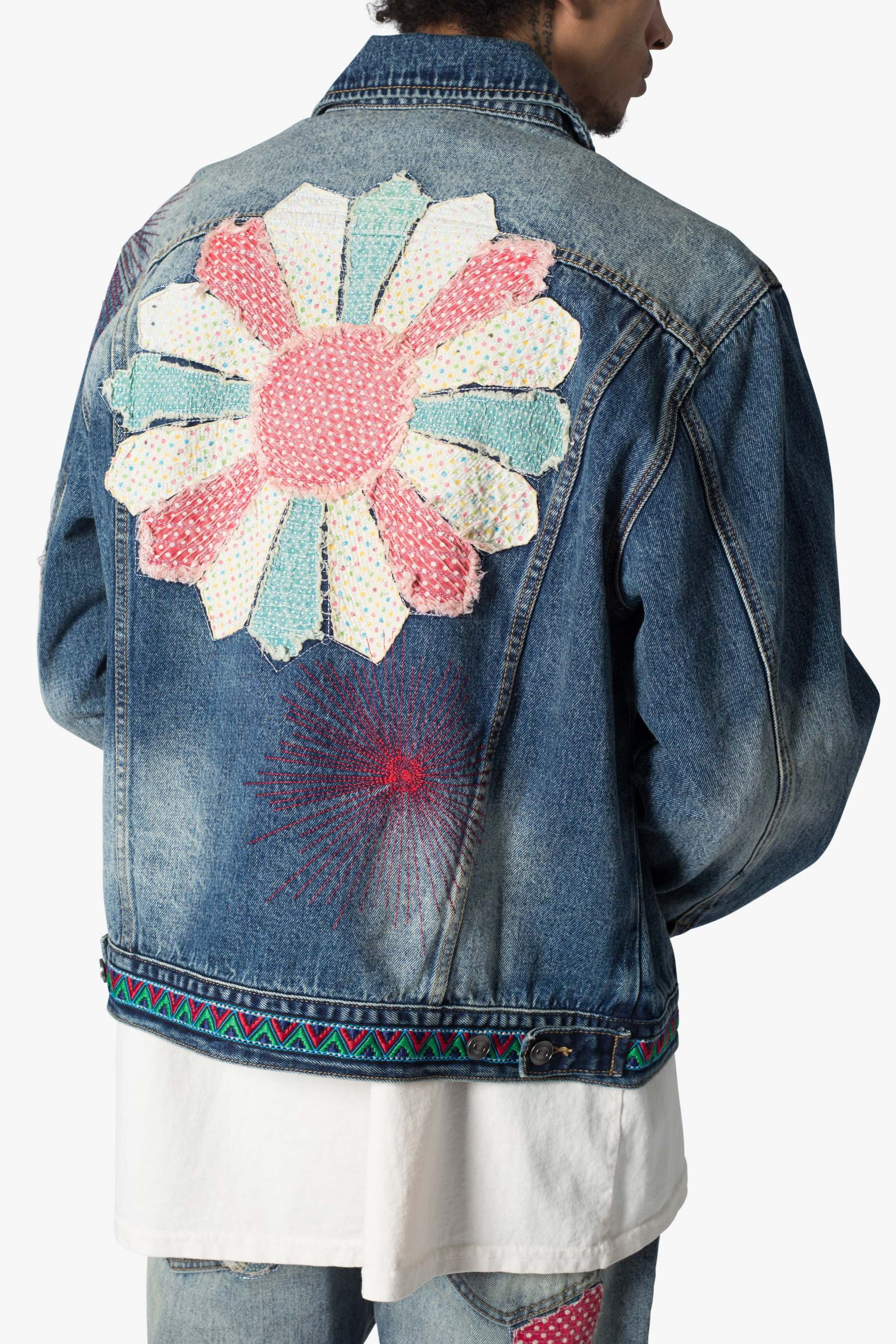 the Rugged Trucker Jacket is designed with a standard fit and features a classic cut and details, constructed from a natural blue denim fabric with a medium wash, embroidery and quilting details throughout. This jacket is the perfect statement piece all year long.